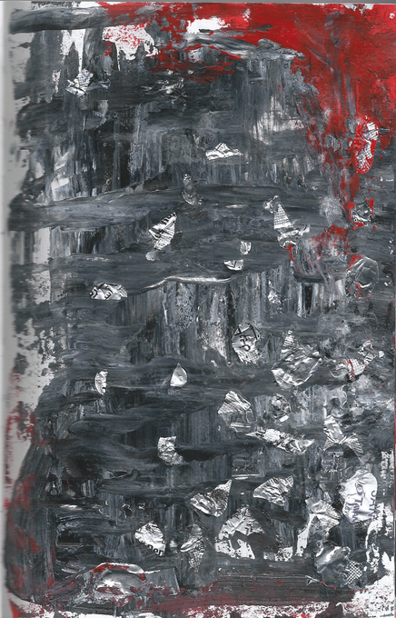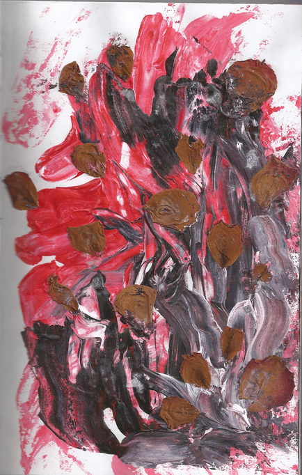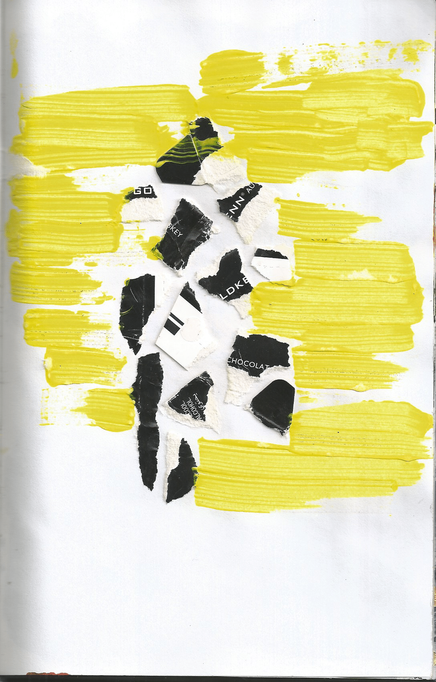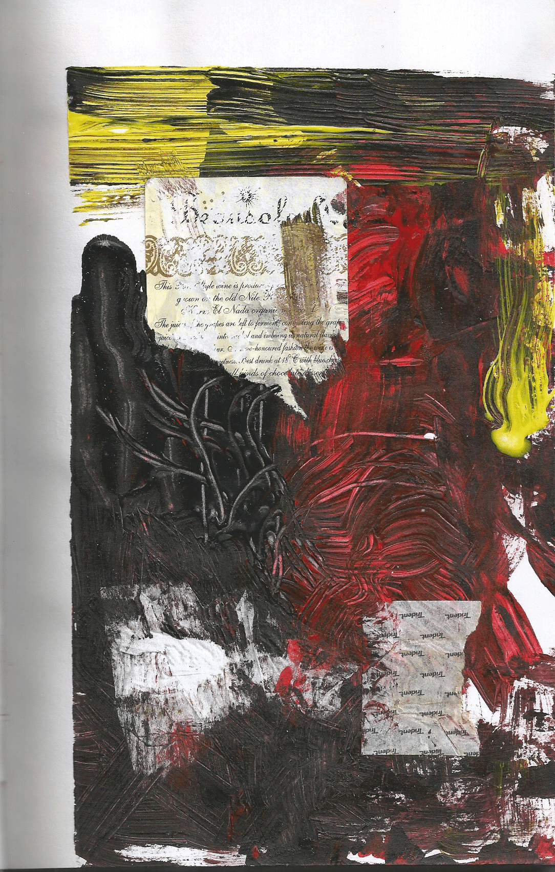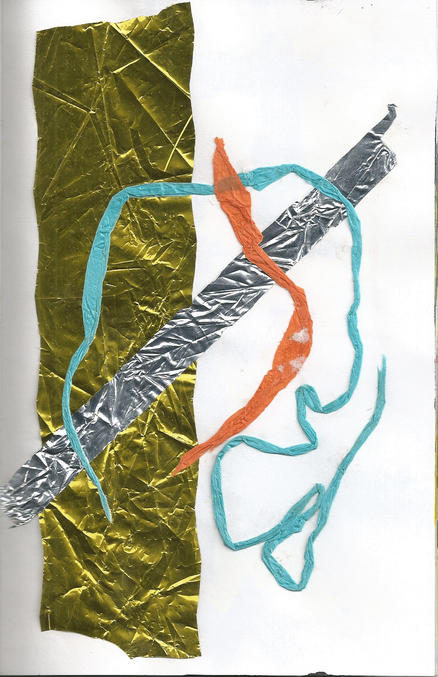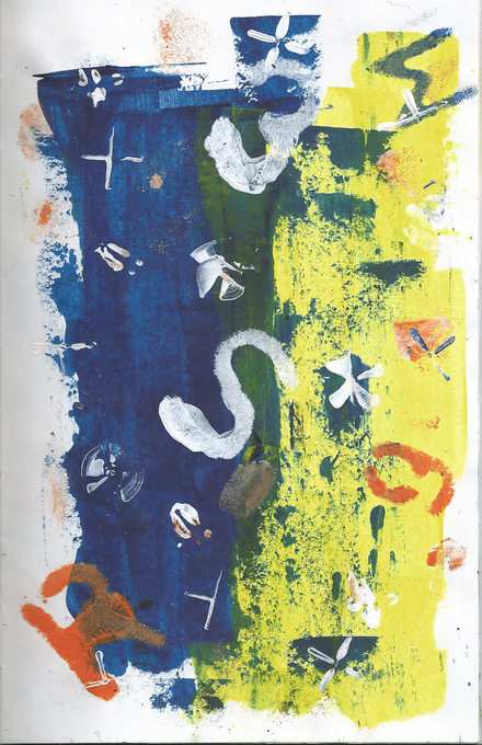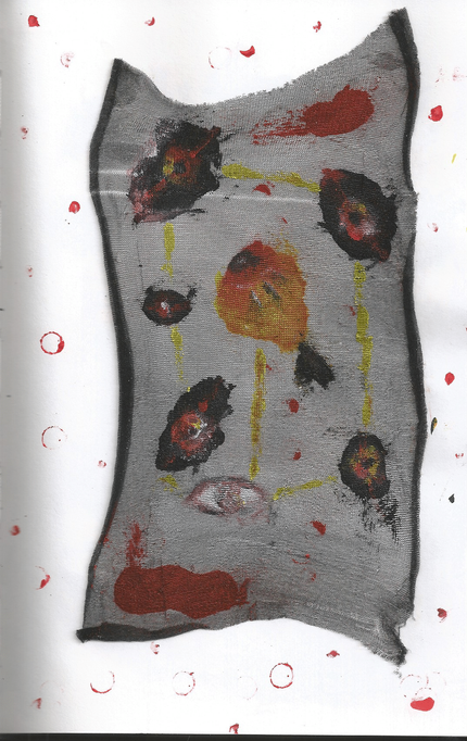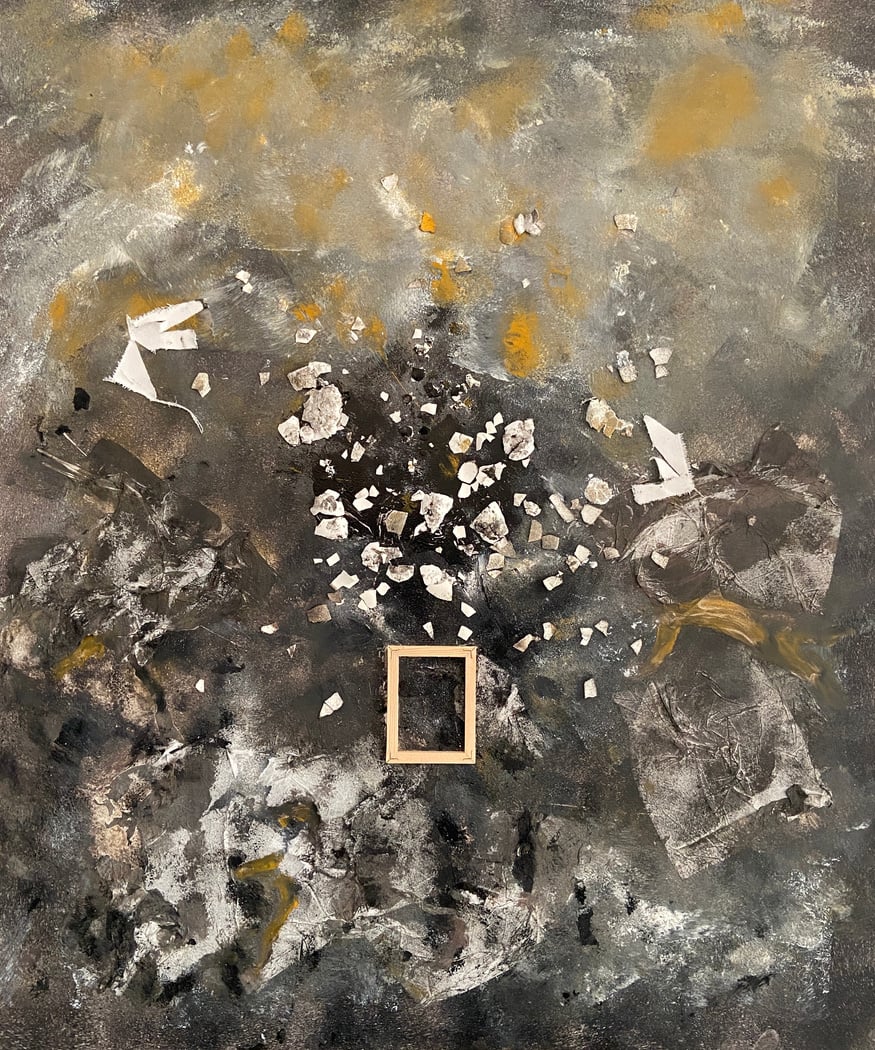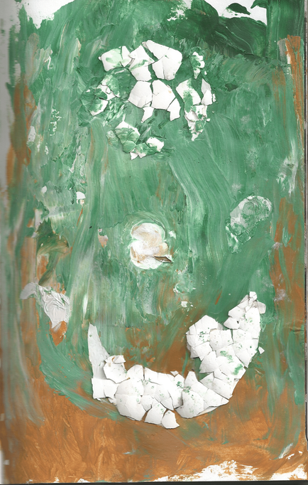 Materials: Acrylic Paint, washed egg shells, tissue paper, wood, and canvas fabric on foam board.