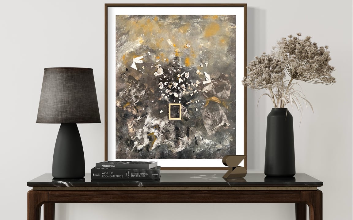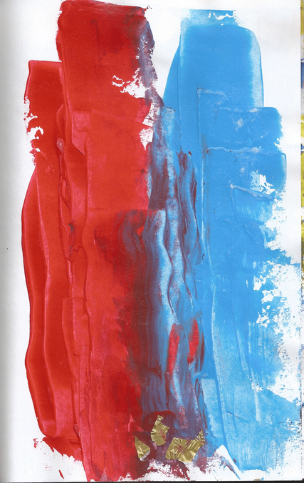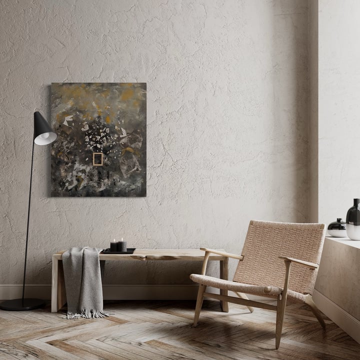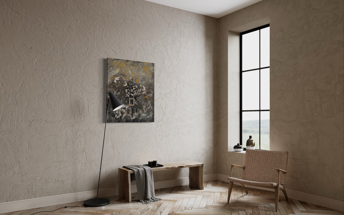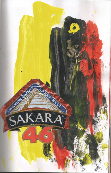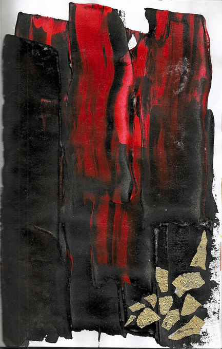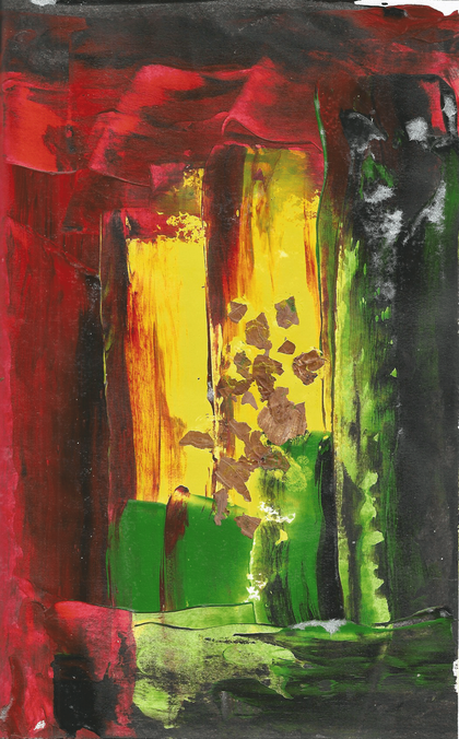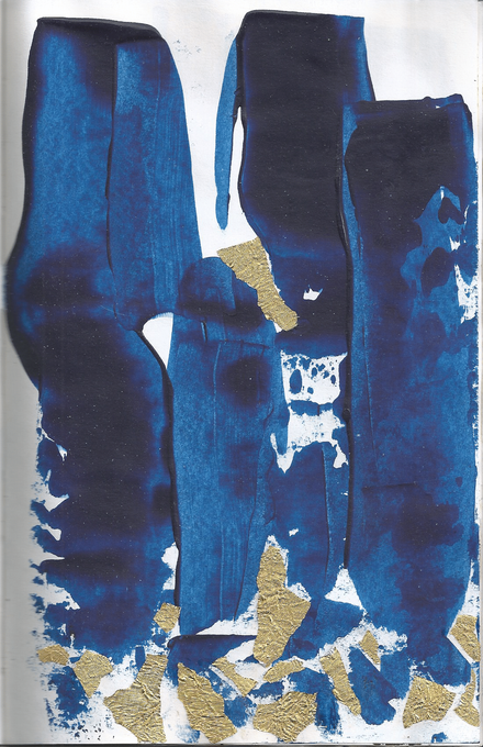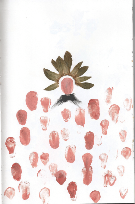 Materials: Acrylic Paint, washed egg shells, tissue paper, wood, and canvas fabric on foam board.